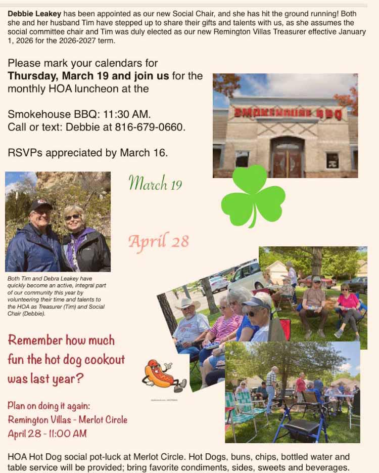 If you are a Facebook user, please join us on our Facebook, members-only group page where we share information, photos, and ideas for making our community even better. Announcements relating to luncheons and other events or activities are generally sent via emai to residents and posted to our Remington Villas Facebook Group page, as well as to the web site.